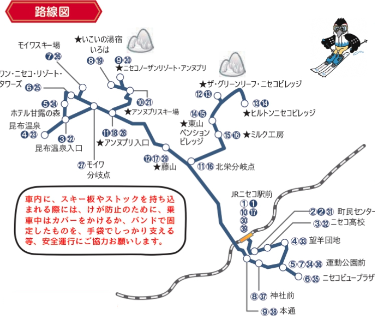 運行スケジュールやルートについては、専用のチラシデータをご確認ください。 冬のニセコを快適に移動する手段として、ぜひ「ニセコ周遊バス」をご活用ください。