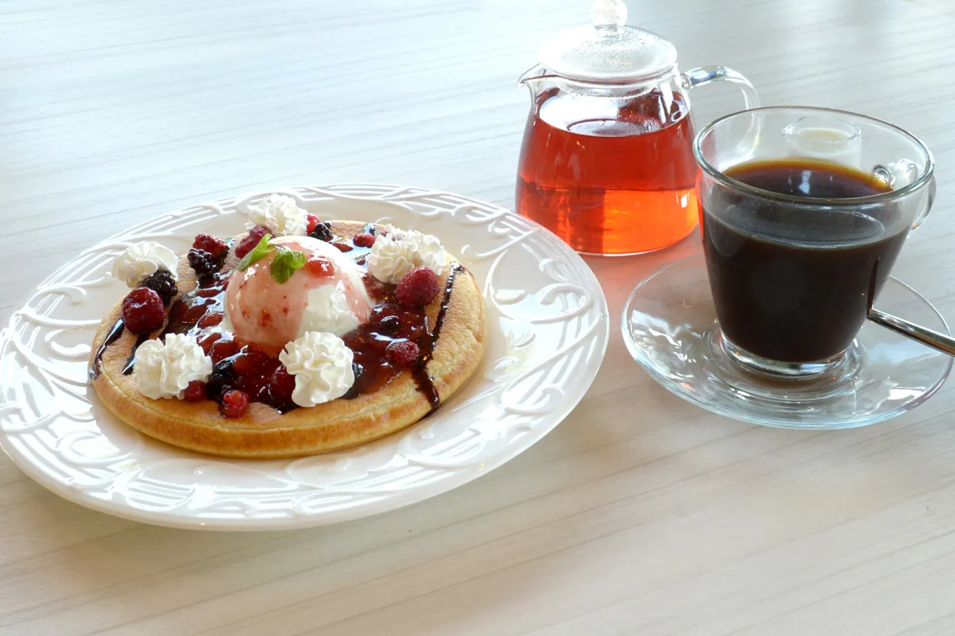 店内の窓越しから望む雄大な景色。お好きなデザートとお飲み物を楽しみながらスローな時間をお過ごしください。